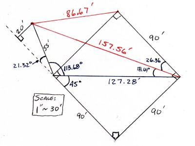 2) Next found the angle between the foul line and the 55' line: arcsin A = 20/55